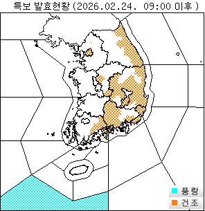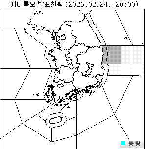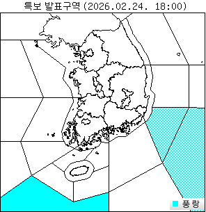 ㆍ 02월 24일 밤(18시~24시) : 동해남부앞바다(울산앞바다), 동해남부남쪽안쪽먼바다, 동해남부남쪽바깥먼바다, 동해남부북쪽안쪽먼바다, 동해남부북쪽바깥먼바다, 남해동부앞바다(부산앞바다, 거제시동부앞바다)