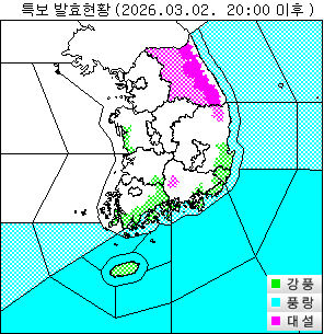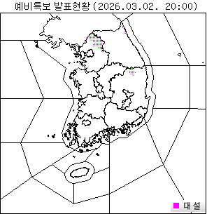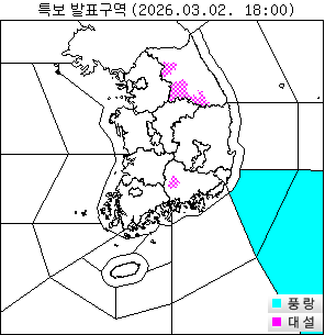 ㆍ 대설주의보 : 강원도(철원, 화천, 홍천평지, 춘천, 양구평지, 인제평지), 경상북도(경북북동산지)